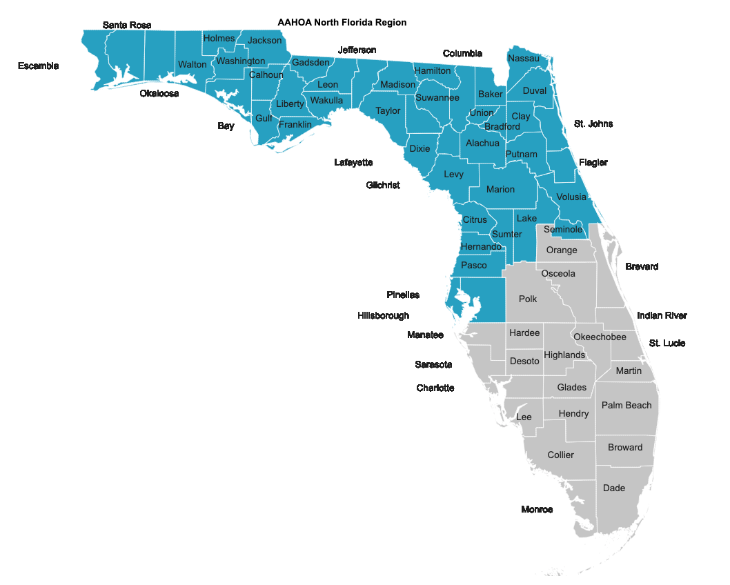 The region is comprised of the following counties: Escambia, Santa Rosa, Okaloosa, Walton, Holmes, Washington, Bay, Jackson, Calhoun, Gulf, Liberty, Franklin, Gadsden, Wakulla, Leon, Jefferson, Madison, Taylor, Hamilton, Suwannee, Lafayette, Dixie, Levy, Gilchrist, Columbia, Baker, Union, Bradford, Alachua, Nassau, Duval, Clay, Putnam, Marion, Citrus, Hernando, Sumter, Marion, Putnam, St. Johns, Flagler, Volusia, Lake, Pasco, Pinellas, Hillsborough, and Seminole.