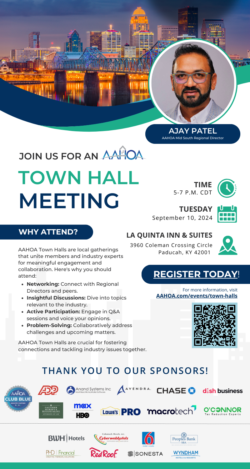 By registering for this event, you consent to receive autodialed, pre-recorded calls, or texts from or on behalf of AAHOA regarding AAHOA events and initiatives at the telephone number provided above. Message or data rates may apply. You consent to share your first name, last name, company name, title, mailing address, and business phone number with AAHOA vendors at this event.