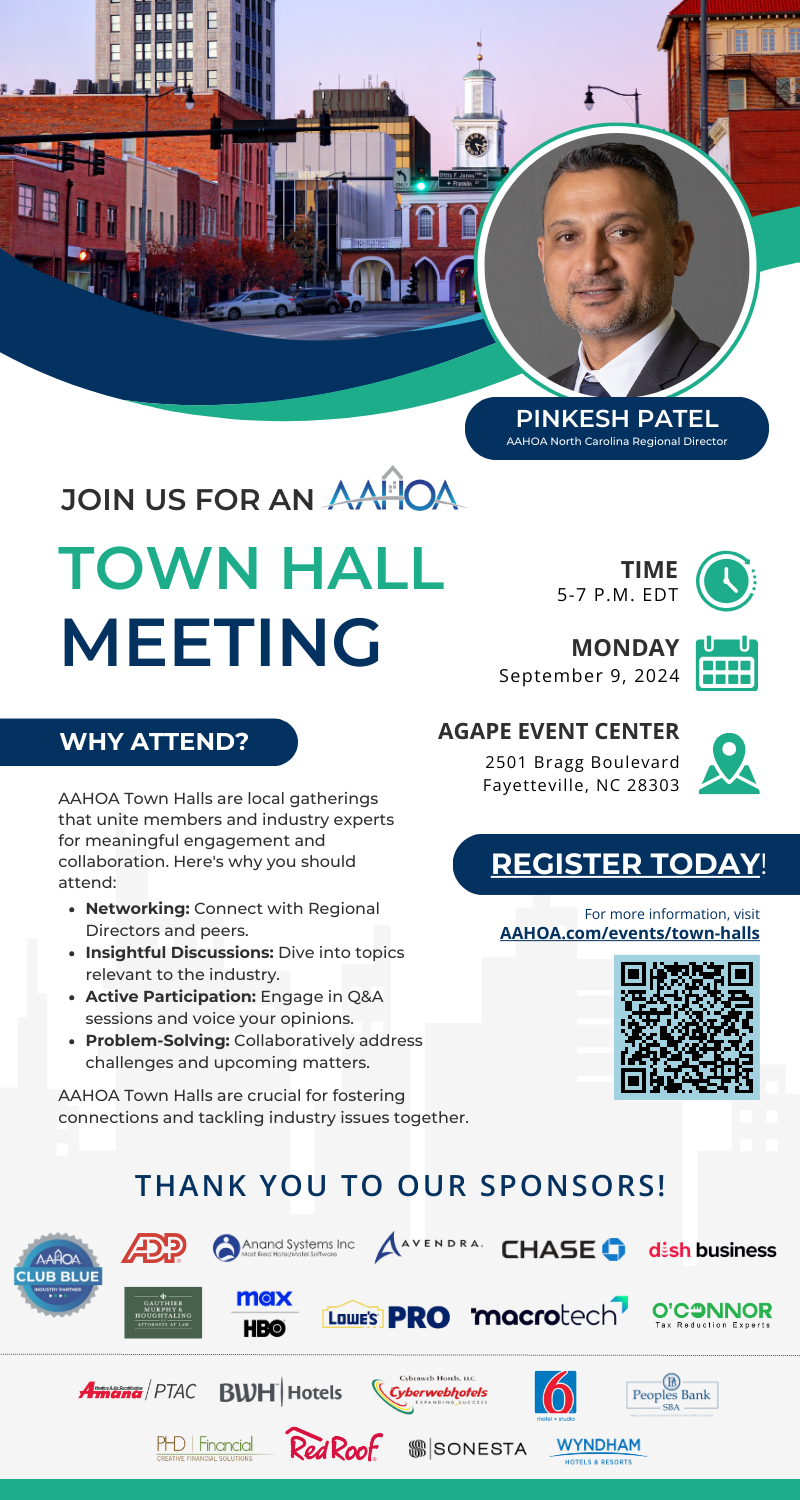By registering for this event, you consent to receive autodialed, pre-recorded calls, or texts from or on behalf of AAHOA regarding AAHOA events and initiatives at the telephone number provided above. Message or data rates may apply. You consent to share your first name, last name, company name, title, mailing address, and business phone number with AAHOA vendors at this event.