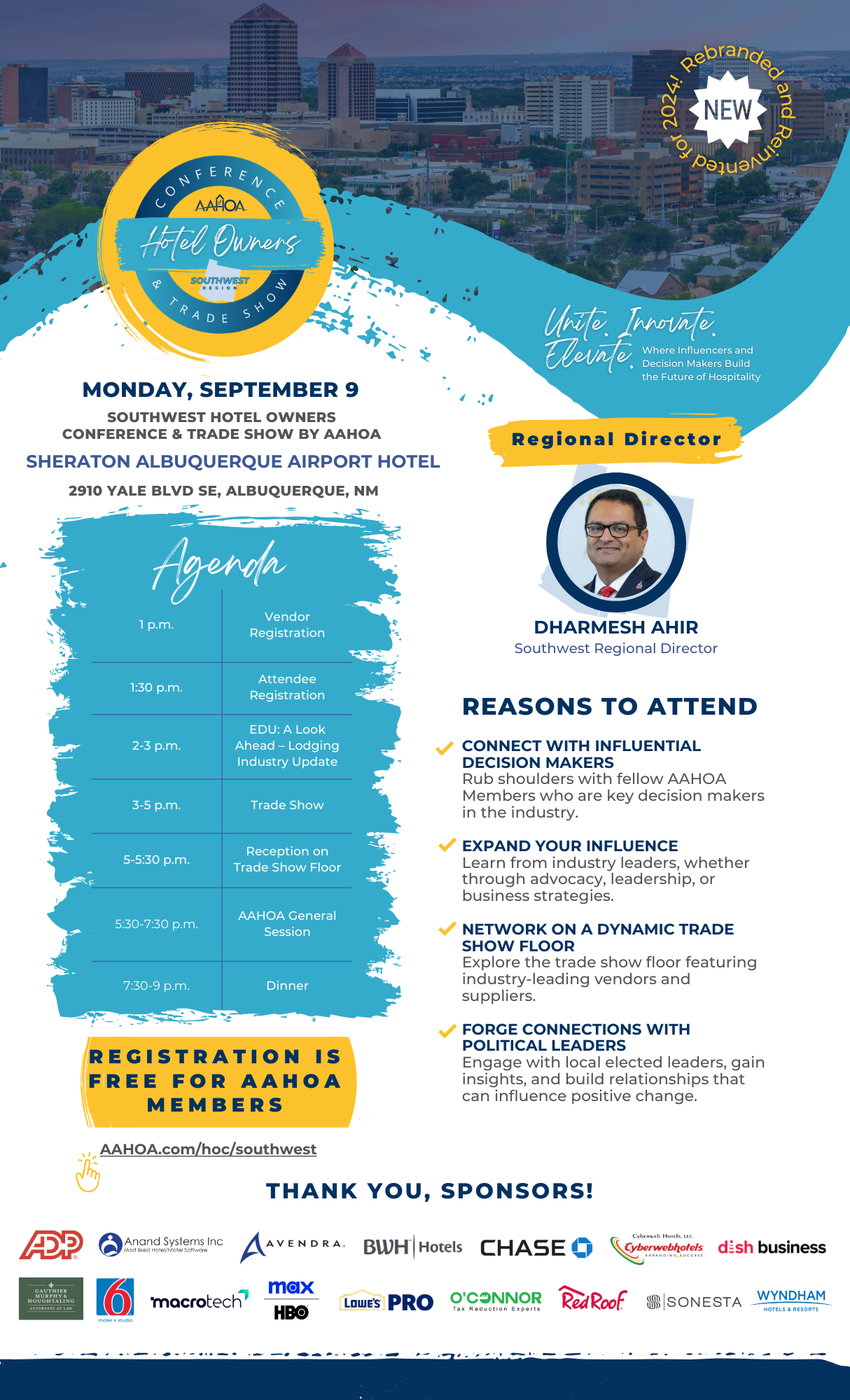 Join us at the 2024 AAHOA Regional Conference and Trade Show Series, where hospitality professionals converge for unparalleled networking, education, and business opportunities. This dynamic event series showcases the latest industry trends, innovations, and best practices in hospitality. Attendees can expect insightful seminars led by industry experts, interactive workshops, and access to a diverse array of vendors showcasing cutting-edge products and services. Whether you're an established hotelier or an aspiring hospitality entrepreneur, our regional conferences offer a platform to connect, learn, and explore new avenues for success in the ever-evolving hospitality landscape. Don't miss this chance to be part of an enriching experience that fosters growth and excellence within the hospitality community.