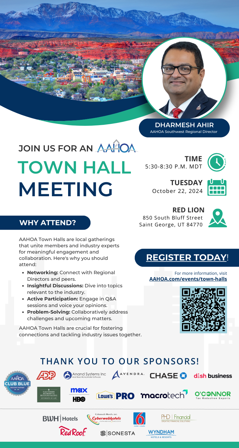 By registering for this event, you consent to receive autodialed, pre-recorded calls, or texts from or on behalf of AAHOA regarding AAHOA events and initiatives at the telephone number provided above. Message or data rates may apply. You consent to share your first name, last name, company name, title, mailing address, and business phone number with AAHOA vendors at this event.