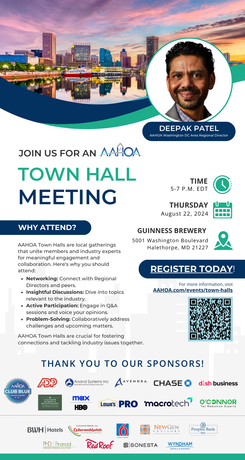 By registering for this event, you consent to receive autodialed, pre-recorded calls, or texts from or on behalf of AAHOA regarding AAHOA events and initiatives at the telephone number provided above. Message or data rates may apply. You consent to share your first name, last name, company name, title, mailing address, and business phone number with AAHOA vendors at this event.